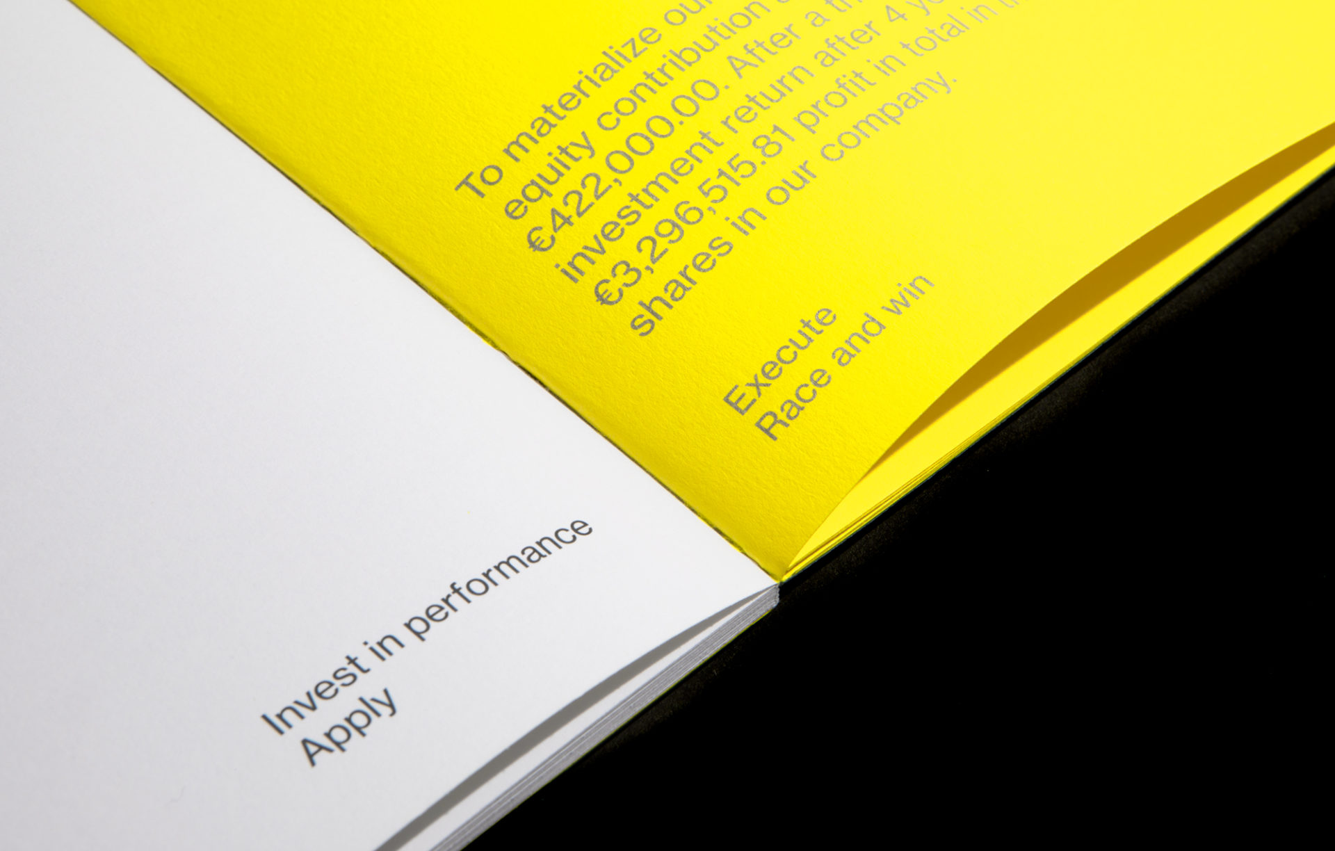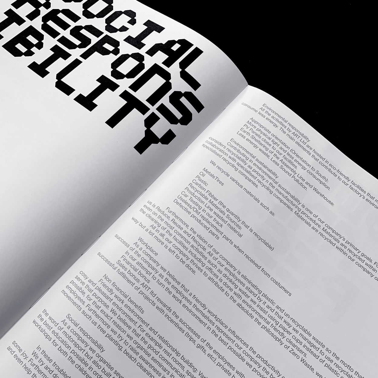In order to establish sufficient hierarchy of information (technical characteristics, infrastructure, organisational model, social responsibility, financial data, etc.) we created a typographic and colour management system, based on ART corporate colours (black, yellow) and used a metal Pantone as a cohesive – structural element of the information, while the different sections are highlighted through typographic forms, with indirect reference to the line and form of ART’s car itself and the individual elements of the Student Formula.